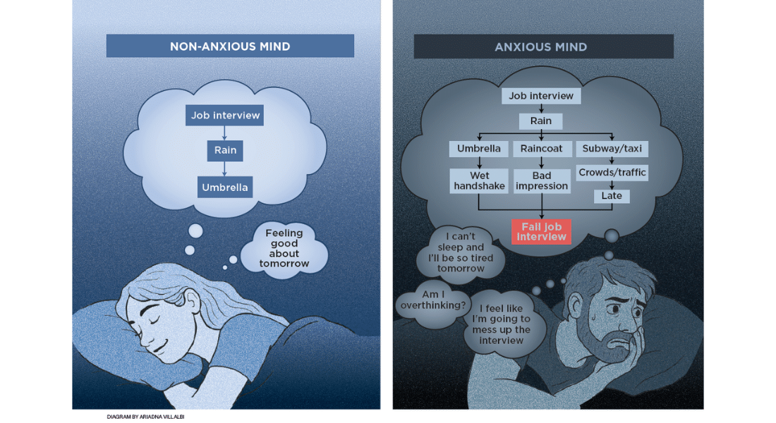 Two people check the weather report on the eve of their big job interviews and notice that tomorrow is likely to be cold and overcast. The first person makes a mental note to pack an umbrella and drifts off to sleep. The second leans an umbrella against the front door so he won’t forget it, then reconsiders and opts for a raincoat instead so he won’t have to juggle a dripping umbrella when he shakes hands with the interviewer. An hour later, he lies in bed, changing plans, deciding to call a taxi so he won’t have to walk to the subway. But what if he can’t find a taxi on time? What if there’s heavy traffic? Should he go back to the first plan and take the subway and an umbrella? Soon enough, an entire night’s sleep has been lost, and our poor interviewee is worse off than if he had never thought about the next day at all.